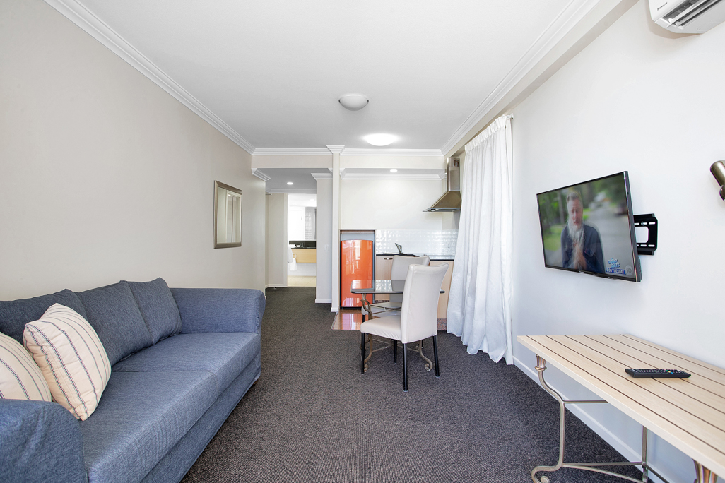 The Executive Room with 1 Queen Size Bed with Balcony is a stylish and contemporary open-concept room that offers a seamless blend of comfort and functionality. The room comprises a combined living and bedroom area, a well-equipped kitchenette, a modern dining table, and a luxurious granite bathroom. Enjoy partial views of the picturesque marina precinct from your own private balcony, while indulging in the room’s premium amenities and sophisticated decor. This room is designed to cater to the needs of discerning guests who seek a superior level of comfort and convenience.